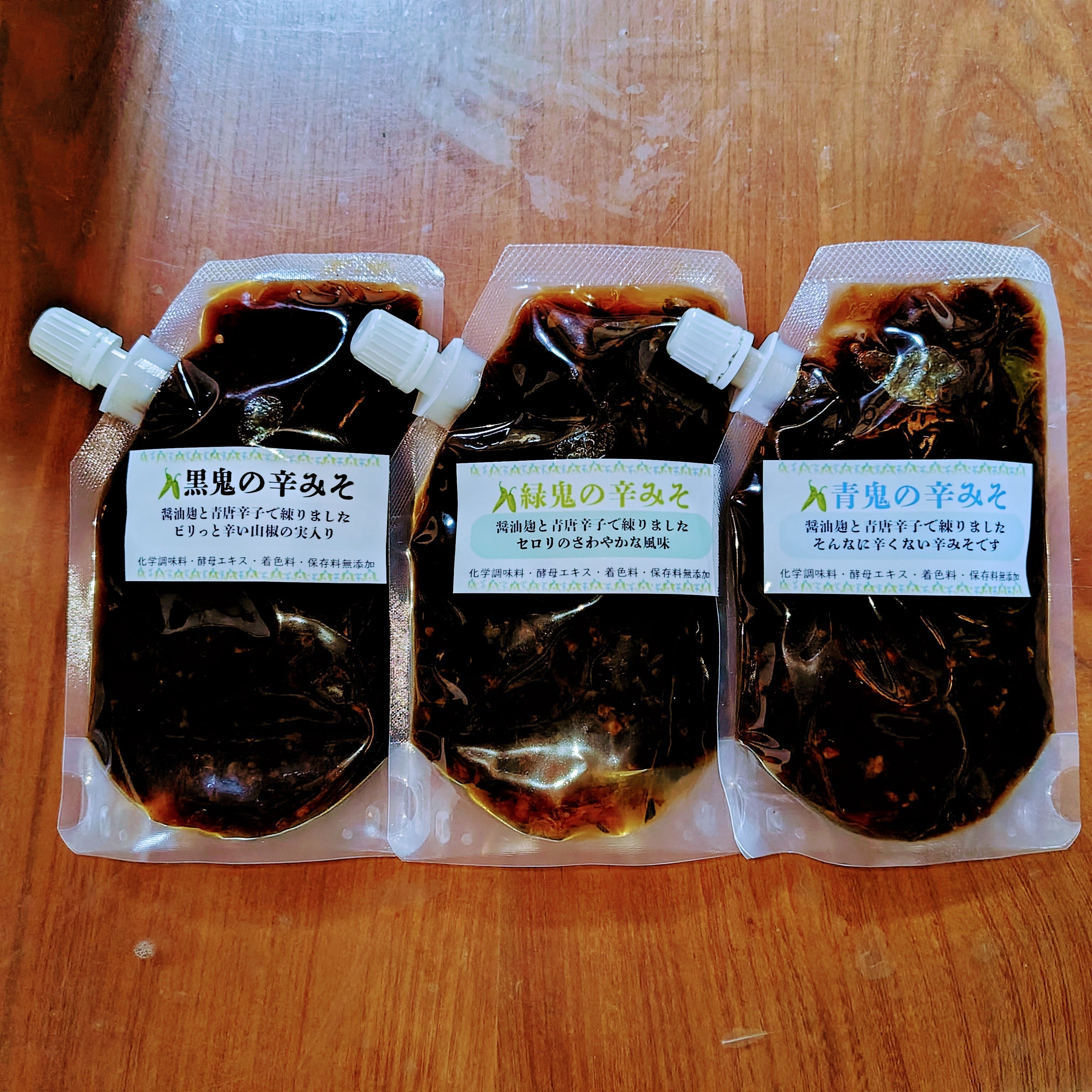青鬼の辛みそと、緑鬼の辛みそと、黒鬼の辛みその3点セットをお届けします。ゆず一味のおまけ付きです。おまけはなくなり次第終了です。