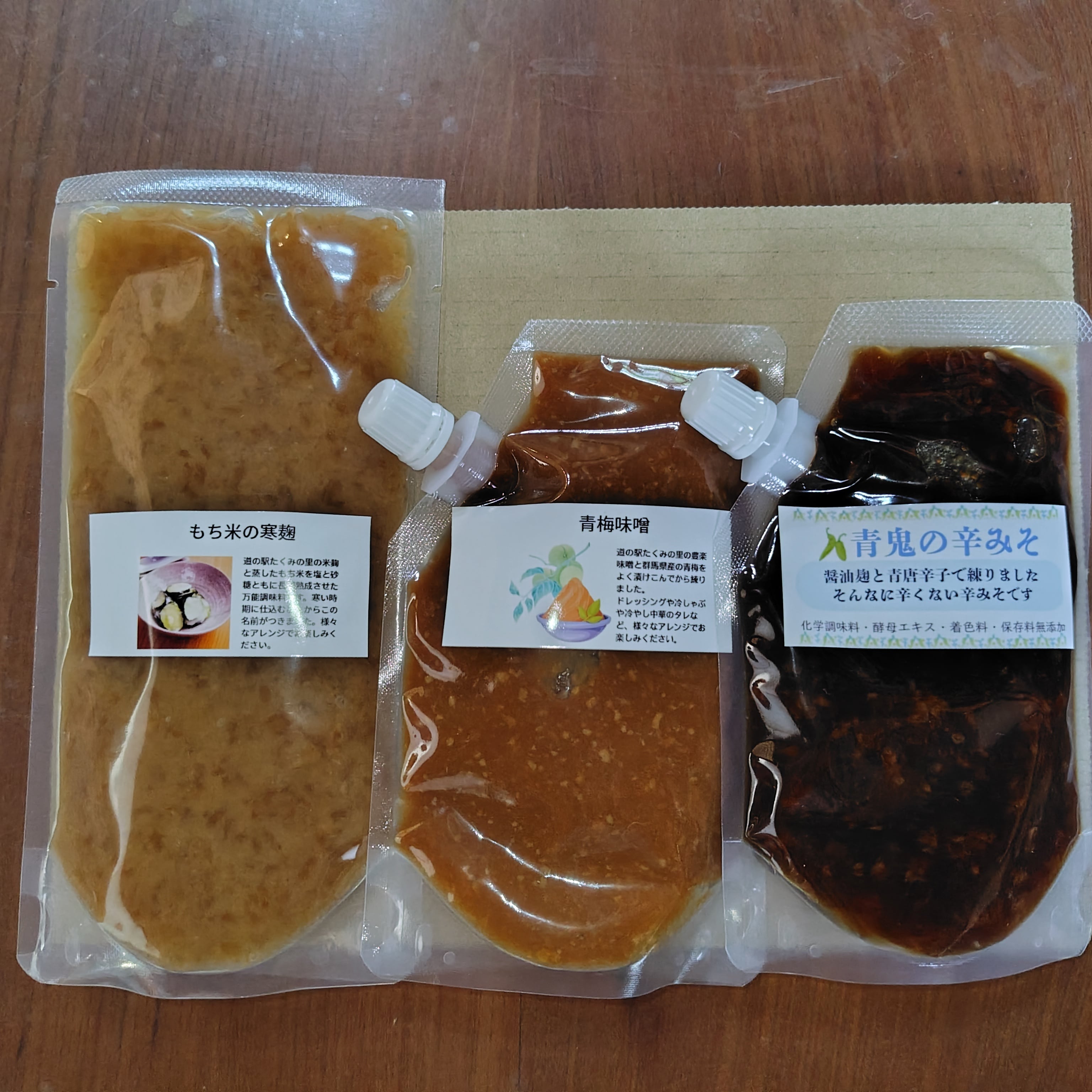 もち米の寒麹、青梅味噌、青鬼の辛みそセットをお届けします。